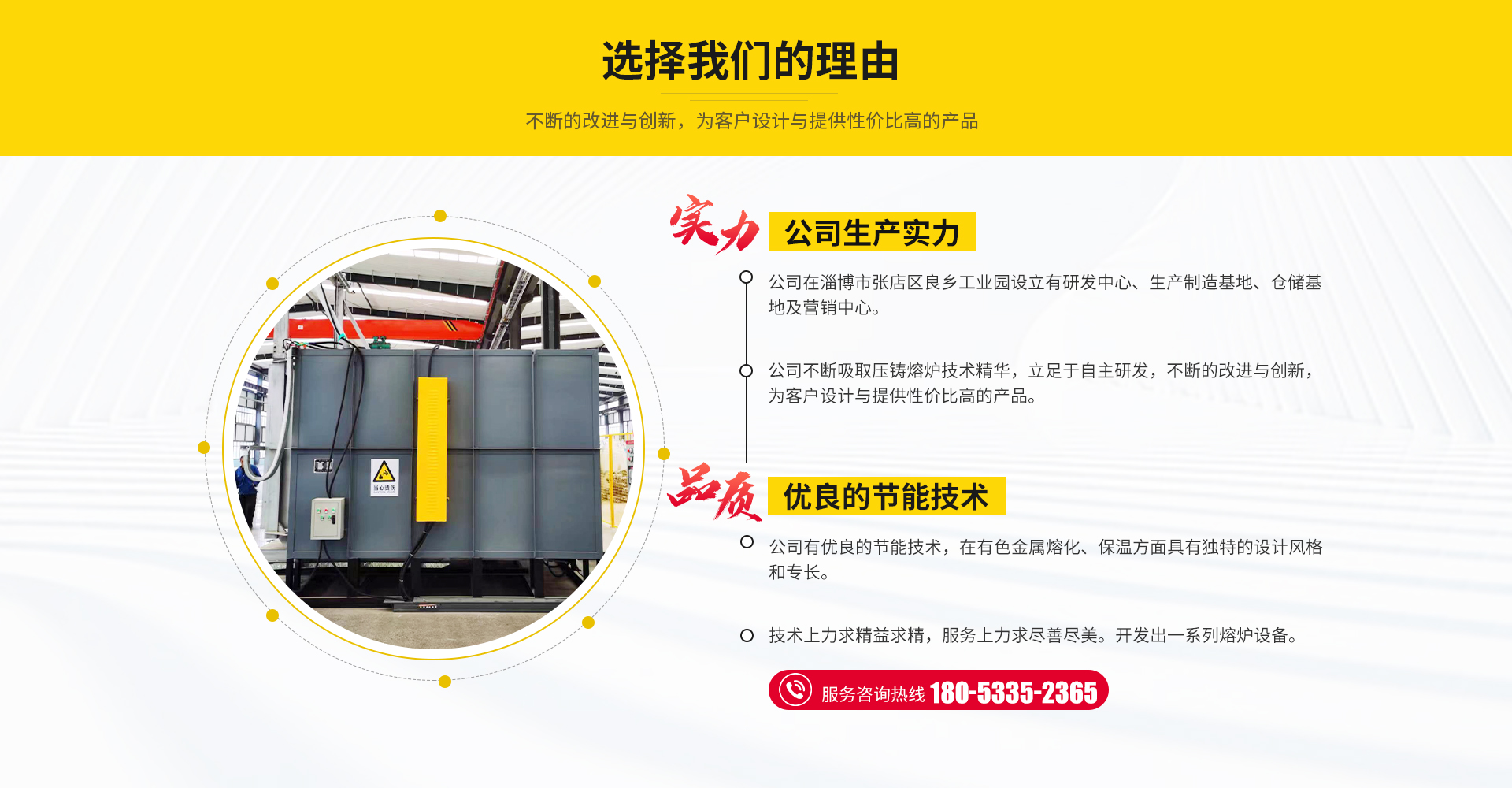 淄博铭晟热能科技有限公司位于淄博市。公司在淄博市张店区良乡工业园设立有研发中心、生产制造基地、仓储基地及营销中心。公司不断吸取压铸熔炉技术精华,立足于自主研发,不断的改进与创新,为客户设计与提供性价比高的产品,优良的节能技术,在有色金属熔化、保温方面具有设计风格和专长。技术上力求精益求精,服务上力求尽善尽美。开发出一系列熔炉设备。公司产品在众多企业使用后,取得了显著的成效并得到一致的好评。